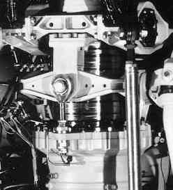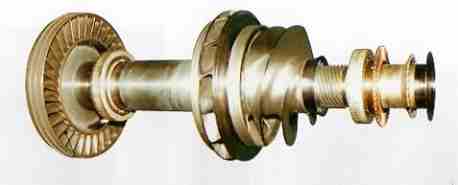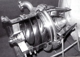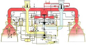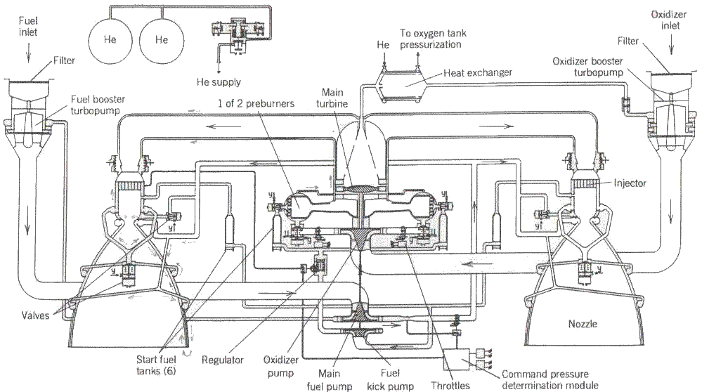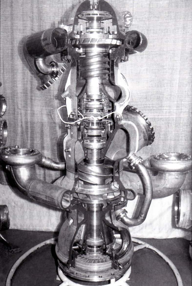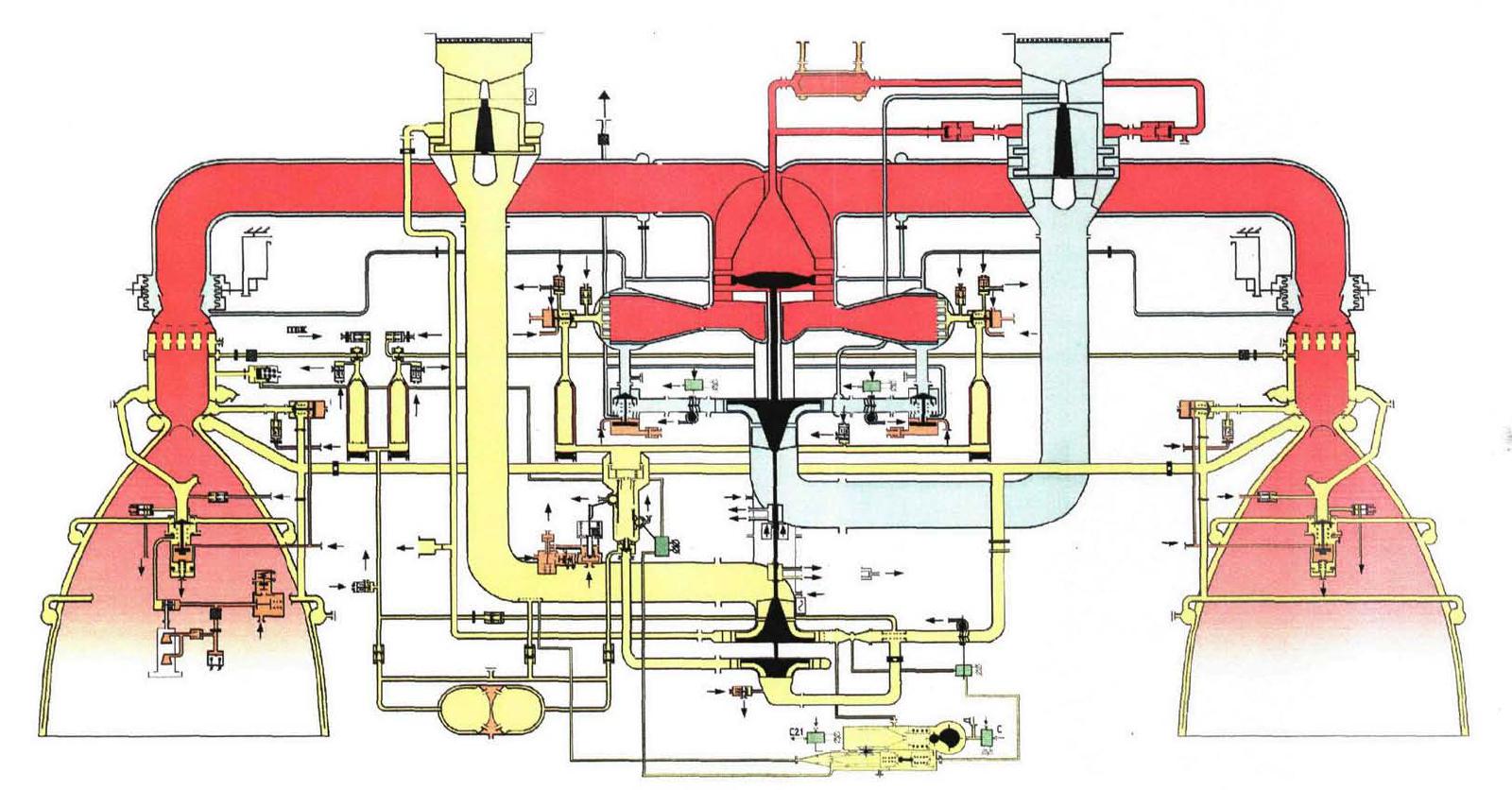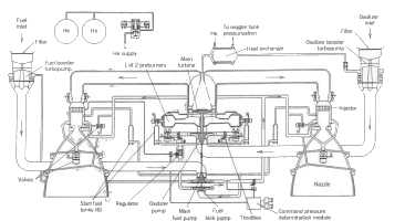 На основном валу с турбиной находится насос окислителя, соосно с которым на другом валу расположены две ступени насоса горючего. Валы насосов окислителя и горючего соединены зубчатой рессорой для разгрузки вала от температурных деформаций, возникающих вследствии большой разницы температур рабрчих тел насосов, а также для предотвращения замерзания горючго.