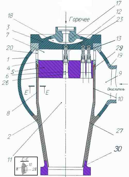 Для подавления пульсаций давления начальная зона смесеобразования и горения, в которой, как правило, зарождаются высокочастотные колебания, разделена на семь примерно одинаковых объемов с помощью антипульсационных перегородок, состоящих из выступающих за огневое днище форсунок, которые неплотно прилегают друг к другу по своим цилиндрическим образующим. Благодаря этому резко повышаются собственные частоты колебаний в объемах между перегородками, смещаясь далеко от резонансных частот конструкции камеры сгорания. Кроме того, выступающие форсунки растягивают зону горения, что также уменьшает возможность возникновения высокочастотных явлений. Зазоры между неплотно прилегающими друг к другу выступающими форсунками оказывают дополнительное демпфирующее влияние. Выступающая за огневое днище часть форсунки охлаждается горючим, проходящим по спиральным каналам (шнековому завихрителю) 6 внутренней втулки.