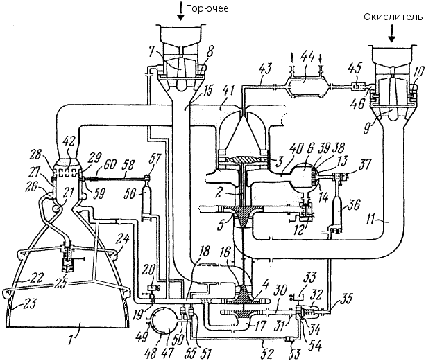 Двигатель содержит содержит камеру сгорания 1, турбонасосный агрегат 2, состоящий из турбины 3, двухступенчатого насоса горючего 4 и одноступенчатого насоса окислителя 5, два газогенератора 6, бустерный насос горючего 7, приводом которого является гидравлическая турбина 8, и бустерный насос окислителя 9, приводом которого является газовая турбина 10. Бустерный насос окислителя (БНАО) 9 через трубопровод 11 соединен со входом насоса окислителя 5, выход которого через пускоотсечной клапан 12 соединен с коллекторной полостью 13 смесительной головки 14 газогенератора 6. На входе БНАО установлен фильтр окислителя. Бустерный насос горючего (БНАГ) 7 через трубопровод 15 соединен со входом первой ступени 16 насоса горючего 4. Первая ступень насоса горючего 16 соединена со входом второй ступени 17 насоса горючего и через трубопровод 18, в котором установлен дроссель 19 с электроприводом 20, соединена с коллектором 21 камеры сгорания 1, из которого горючее распределяется по каналам 22 регенеративного охлаждения камеры сгорания 1. На входе БНАГ установлен фильтр горючего. Каналы 22 регенеративного охлаждения сопла 23 через коллектор 24 соединены с пускоотсечным клапаном 25. Выход этого клапана соединен с коллектором 26, размещенным на цилиндрической части камеры сгорания. Выход коллектора 26 через регенеративные каналы 27 охлаждения цилиндрической части камеры сгорания соединен с полостью горючего 28 смесительной головки 29 камеры сгорания 1. Вторая ступень 17 насоса горючего 4 (через который проходит 20% от общего расхода горючего) через трубопровод 30 соединена с основным входом 31 регулятора тяги 32, управляемого электроприводом 33 и имеющим на входе обратный клапан 34. Выход 35 регулятора тяги 32 соединен с ампулами 36 (2 шт.), заполненными пусковым горючим триэтилалюминием Аl(С2Н5)з. Выходы из этих ампул через пускоотсечные клапаны 37 соединены с полостью горючего 38 смесительных головок 39 газогенераторов 6. Выход газогенераторов 40 соединен с турбиной 3, выход которой через трубопроводы 41 соединен с полостью 42 смесительных головок 29 камер сгорания 1. Кроме того, выход из турбины 3 через трубопровод 43, в котором установлен теплообменник 44 и клапан давления 45, соединен с коллектором турбины 46 привода бустерного насоса 9 окислителя. Пневмогидравлическая схема ЖРД содержит также систему запуска, которая включает пусковой бачок 47 с разделительной мембраной 48, патрубок 49 подвода газа высокого давления и выходной патрубок 50. Выходной патрубок 50 пускового бачка 47 через заправочный клапан 51 соединен с трубопроводом 15 подвода горючего от бустерного насоса горючего 7. Кроме того, выходной патрубок 50 с одной стороны через трубопровод 52, в котором установлен обратный клапан 53, соединен со вторым входом 54 регулятора тяги 32, через который осуществляется запуск двигателя, а с другой стороны - через обратный клапан 55 - соединен с ампулой 56, заполненной пусковым горючим (гиперголем), выход которой через клапан 57 соединен с магистралью 58 подвода пускового горючего к форсункам зажигания 59 камеры сгорания. В магистрали 58 установлен жиклер 60, обеспечивающий дозированную подачу пускового горючего к форсункам зажигания. Для уменьшения импульса последействия пускоотсечные клапаны горючего установлены между охлаждающими трактами сопла и камеры сгорания (клапаны 25), а также перед коллек