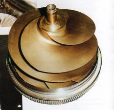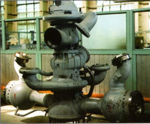 Бустерный насос окислителя состоит из высоконапорного шнека и двухступенчатой газовой турбины, привод которой осуществляется окислительным газом, отбираемом после основной турбины с последующим перепуском его на вход в основной насос.