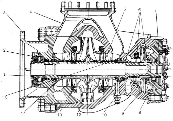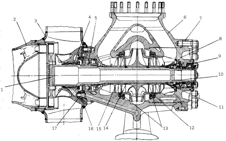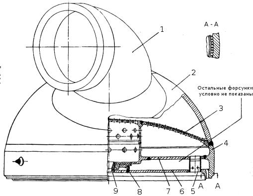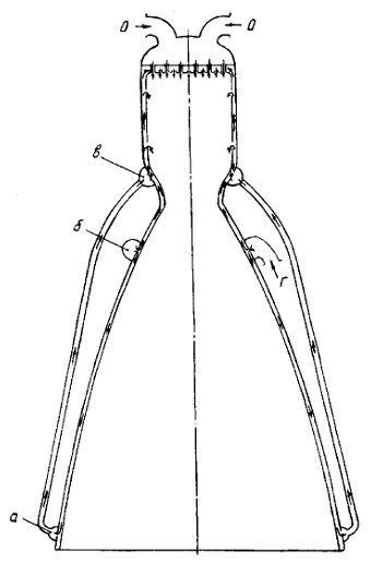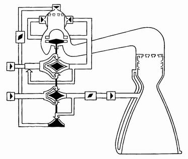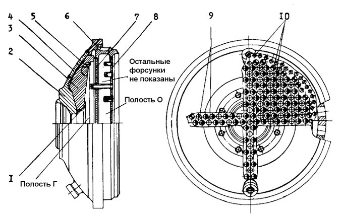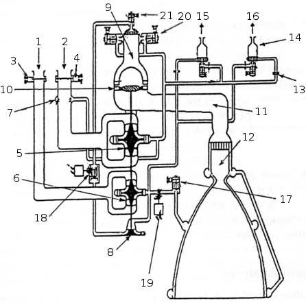 Горючее из первой ступени насоса 13 подается к коллектору камеры сгорания и, пройдя по зарубашечному пространству, через форсунки впрыскивается в КС с некоторые запаздыванием относительно окислительного газа. Определенное весовое соотношение компонентов обеспечивается установкой расходных шайб: 6-горючее и 31-окислитель.
