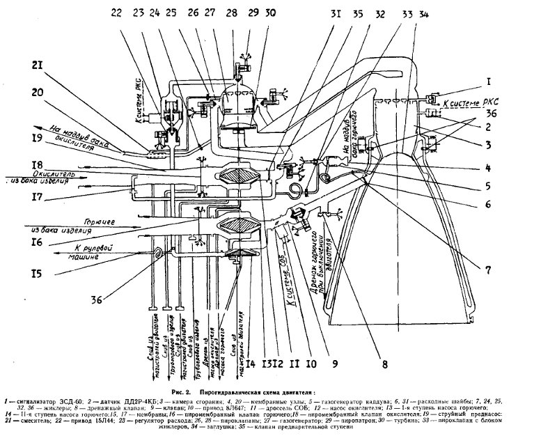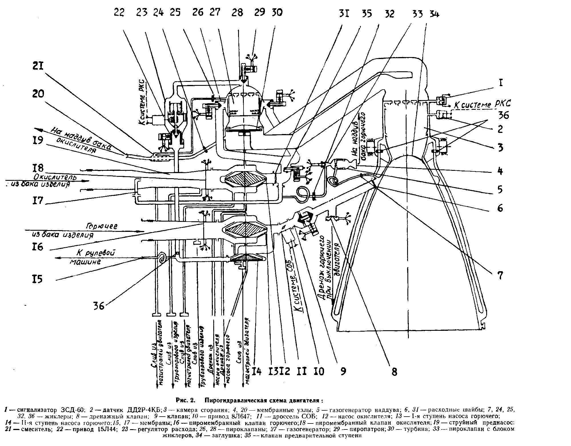 Вторая команда на выключение двигателя подается через 0,2 ± 0,03 сек. По этой команде закрываются пироклапаны 26 окислителя основного газогенератора, клапан 9 горючего. КС и открывается дренажный клапан 8. При закрытии указанных клапанов прекращается доступ соответствующих компонентов топлива в газогенераторы, камеру сгорания и смеситель. Двигатель прекращает работу. При открытии дренажного клапана 8 горючее из за рубашечного пространства КС выбрасывается в атмосферу для уменьшения импульса последействия.