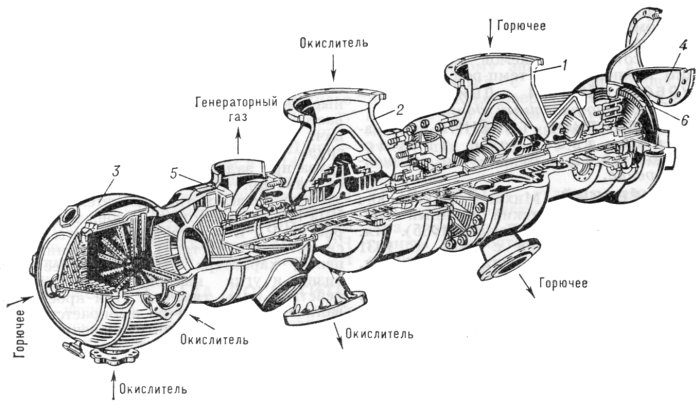 Двигатель выполнен по замкнутой схеме с дожиганием окислительного генераторного газа после турбины.