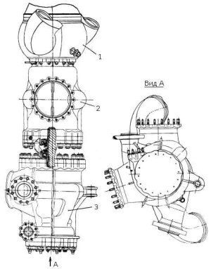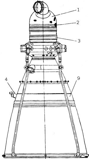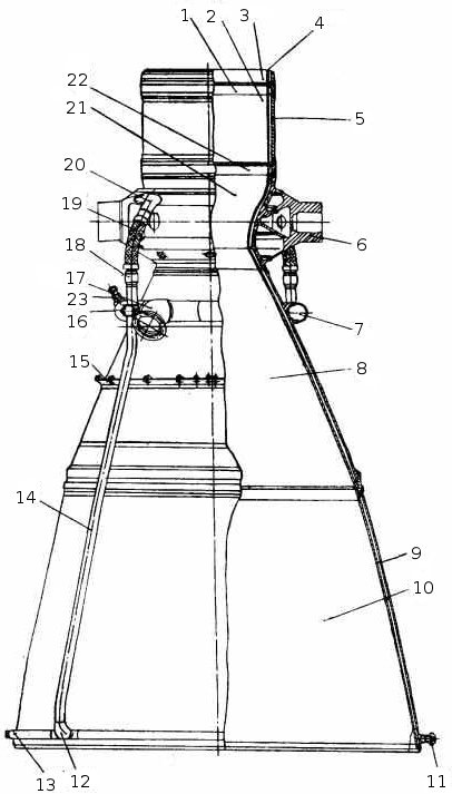 Ранний вариант двигателя (см. рис.1) с пиротурбинным способом запуска содержал также пусковую турбину, расположенную на противоположном от основной турбины конце ТНА, работающую от специальной пирошашки с отводом отработанных газов с помощью выхлопного патрубка. Кроме того, его компоновка отличалась от современной (см. рис.2). В частности, газогенератор был расположен выше смесительной головки камеры, а газоводы, соединяющие выход основной турбины и смесительную головку камеры, были более короткими.