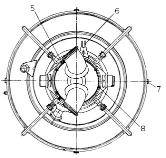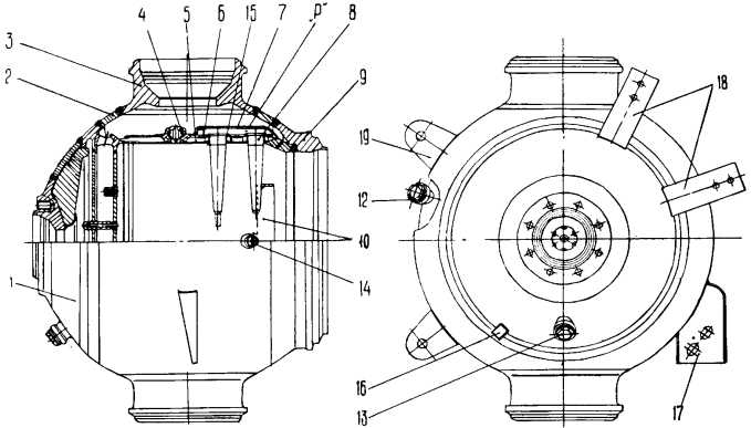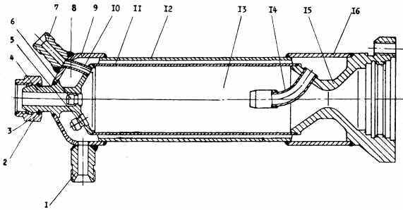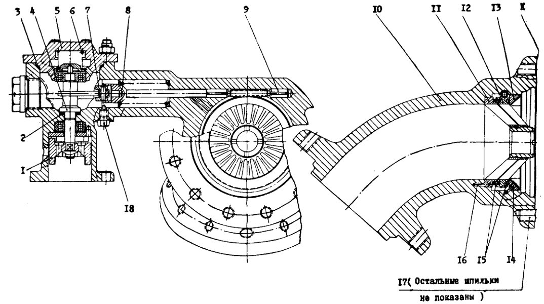 Решетка 11 фиксируется от проворачивания штифтом 16, запрессованным в корпус. От перемещения в осевом направлении решетки удерживаются гайкой 13, которая контрится винтом 14. Для уменьшения усилия, необходимого для поворота решетки 12, последняя установлена между гайкой 13 и решеткой 11 на стальных шариках 15). Решетка 12 со штоком 9 находится в червячном зацеп­лении. Шток через ролик 7 прижимается усилием пружины 8 к поверхности кулачка 4 и о от проворачивания удерживается пробкой 18.