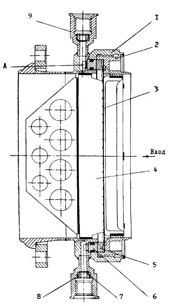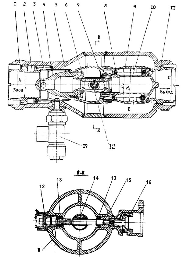 В корпусе 1 со стороны выхода на резьбе установлена направляющая 10 с золотником 9 и пружиной 8. Золотник предназначен для изменения гидравлического сопротивления между полостями Б и С, пружина - для уравновешивания сил от перепада давлений на эффективной площади золотника. Эффективная площадь золотника - кольцевая поверхность, ограниченная диаметрами D1 и D2.