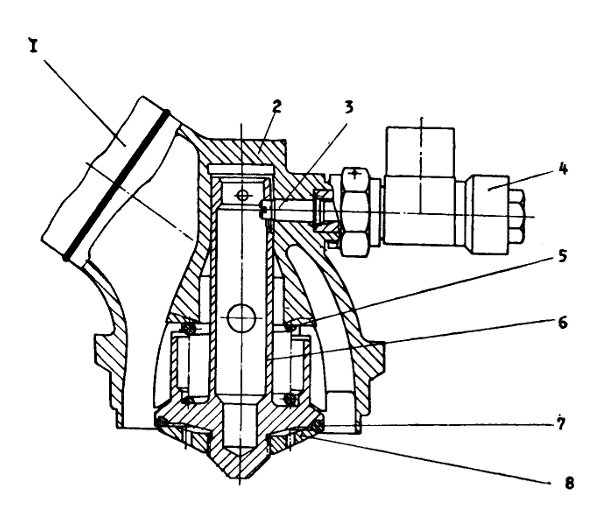 Игла 5 предназначена для изменения расхода компонента через регулятор. Перемещается игла при помощи валика 14, который находится в зацеплении с рейкой . Рейка устанавливается в обойме 6 и прижимается торцем иглы 5. Валик 14 установлен на двух шарикоподшипниках 13. На валике крепится полумуфта 16, которая стыкуется с полумуфтой выходного вала привода РКС.