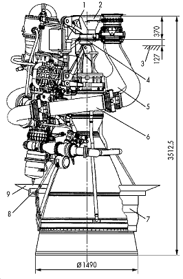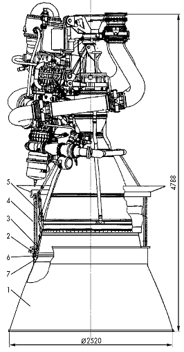 Модификации двигателяДвигатель НК-43 является высотной модификацией двигателя НК-33. Оба двигателя имеют общую верхнюю часть: камеру сгорания, ТНА, агрегаты автоматики и начальный участок сопла. Степень расширения сопла двигателя НК-43 увеличена. Внутренняя оболочка сопла до сечения диаметром 1500 мм изготовлена из бронзы, а остальная часть - из стали. Таблица 3. Технические параметры двигателя